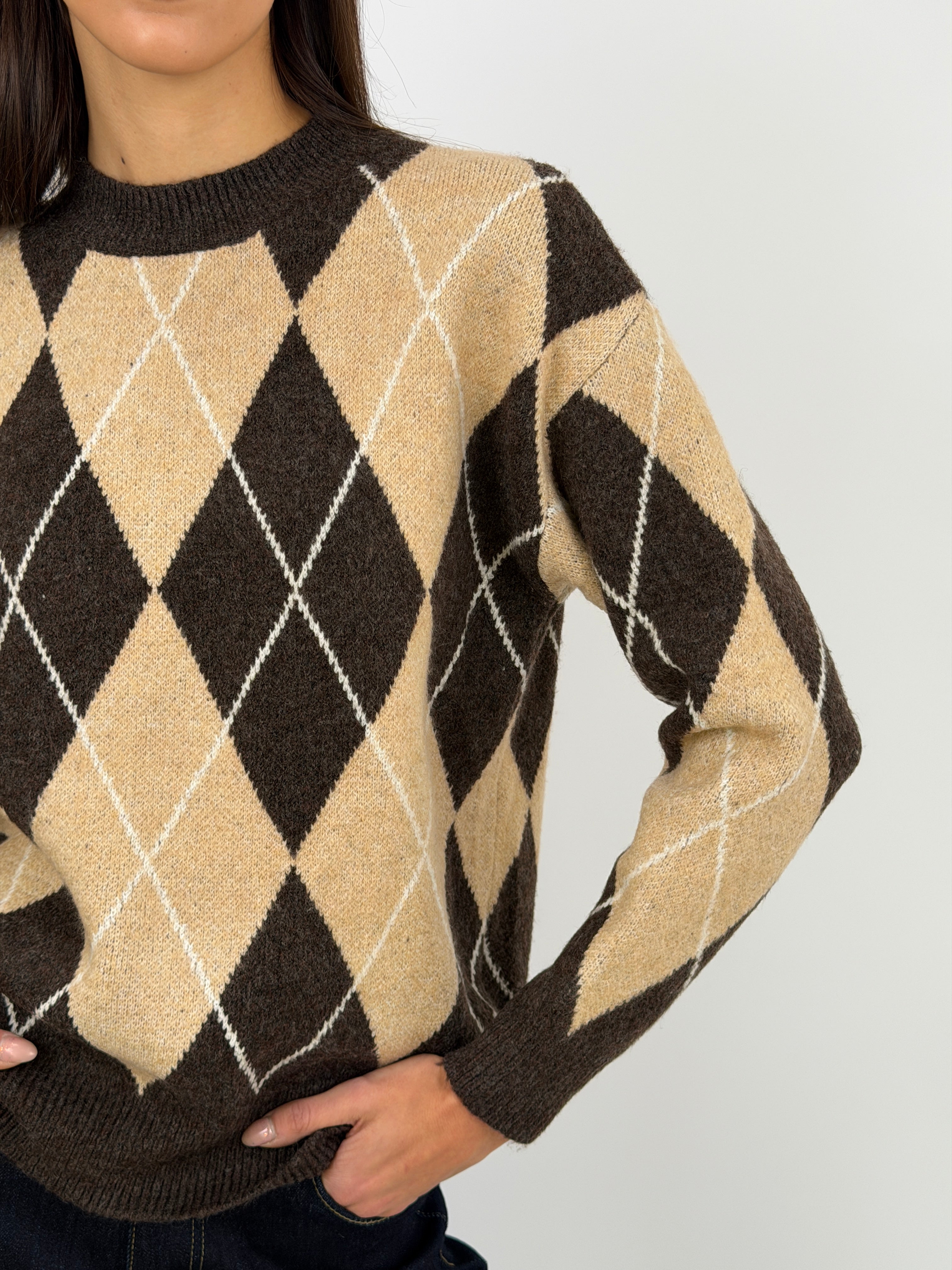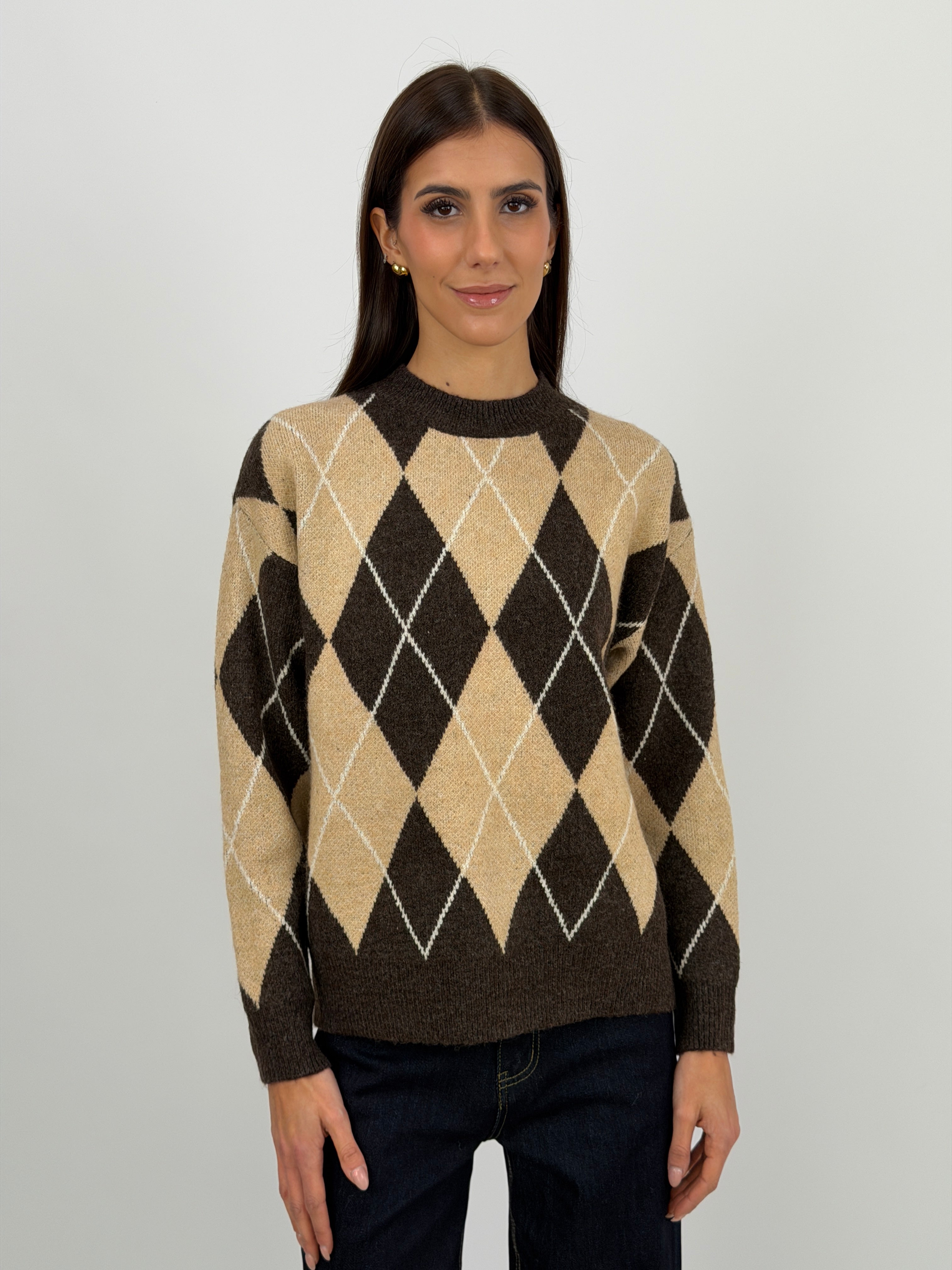Pullover a girocollo con motivo a rombi beige e marrone, maniche lunghe e finiture a coste