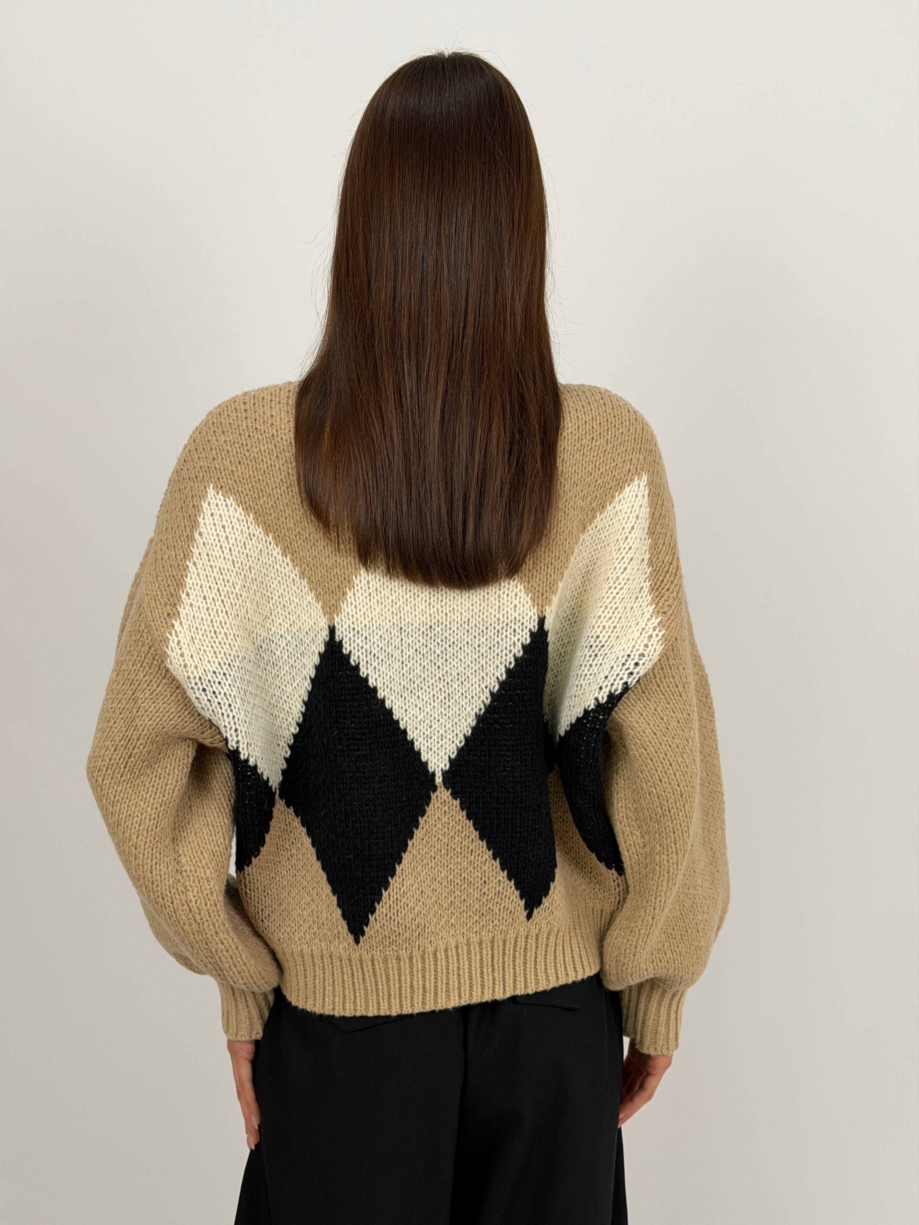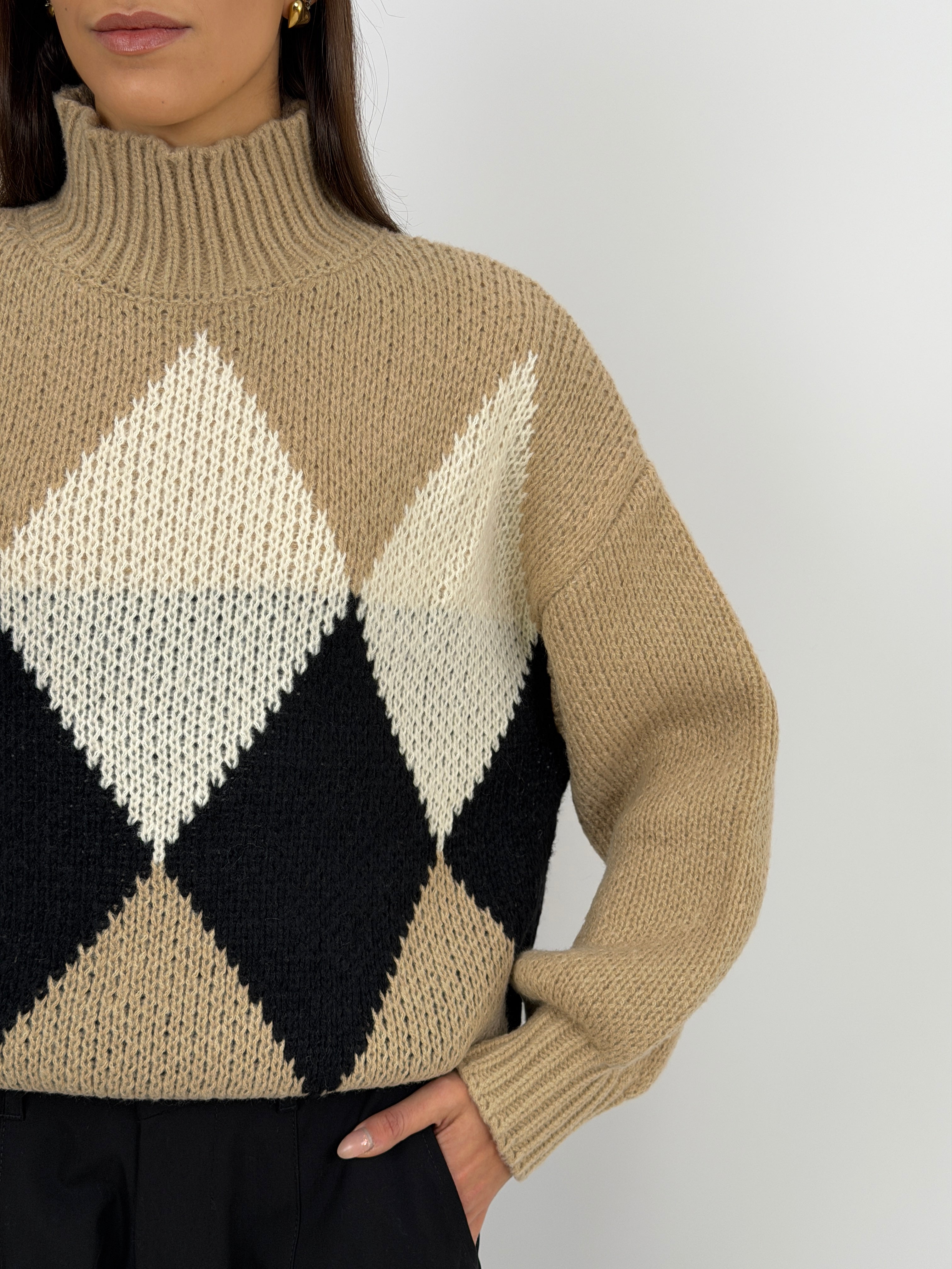 Maglione beige con collo alto, motivo a losanghe a contrasto e finiture a coste