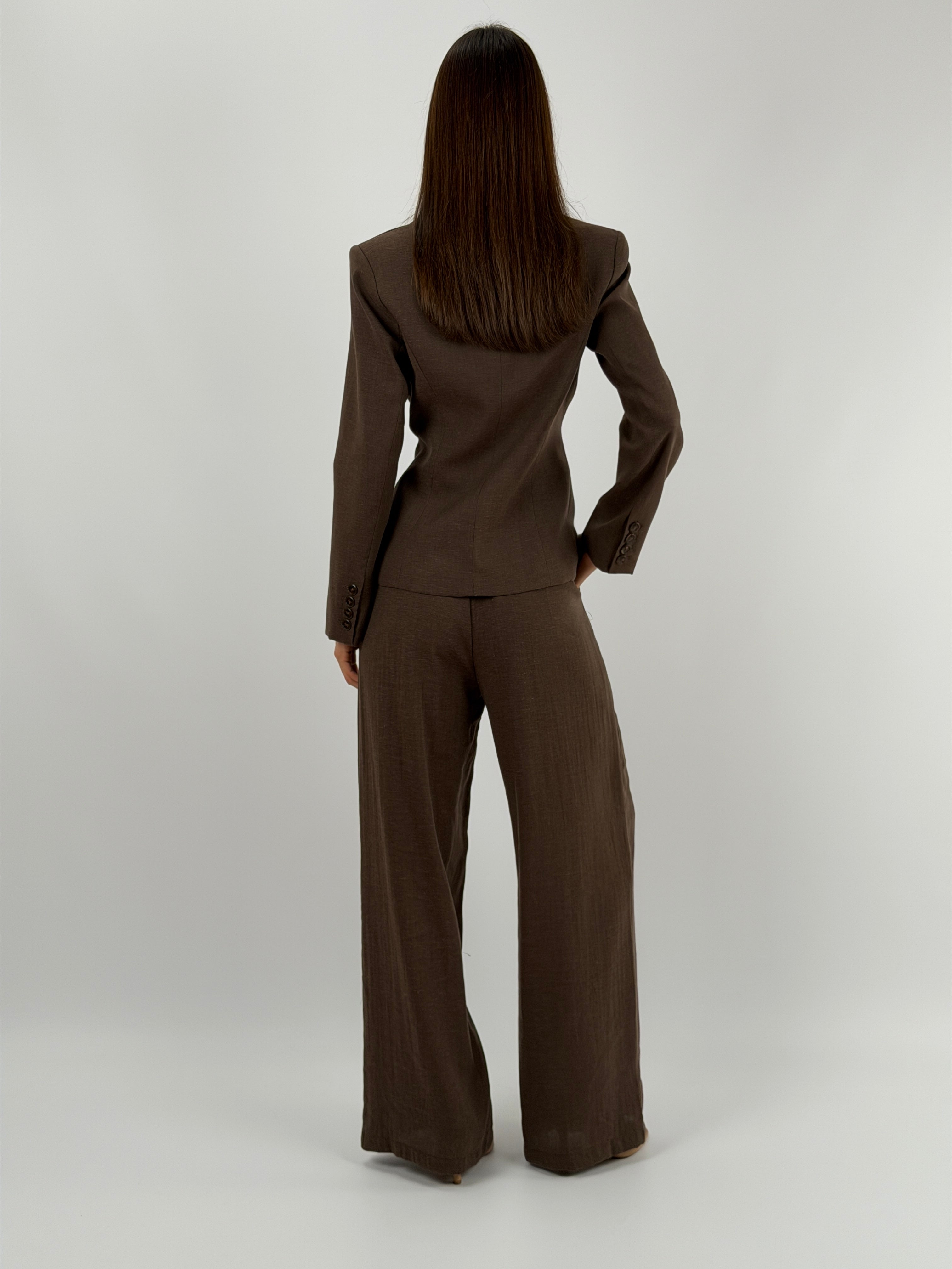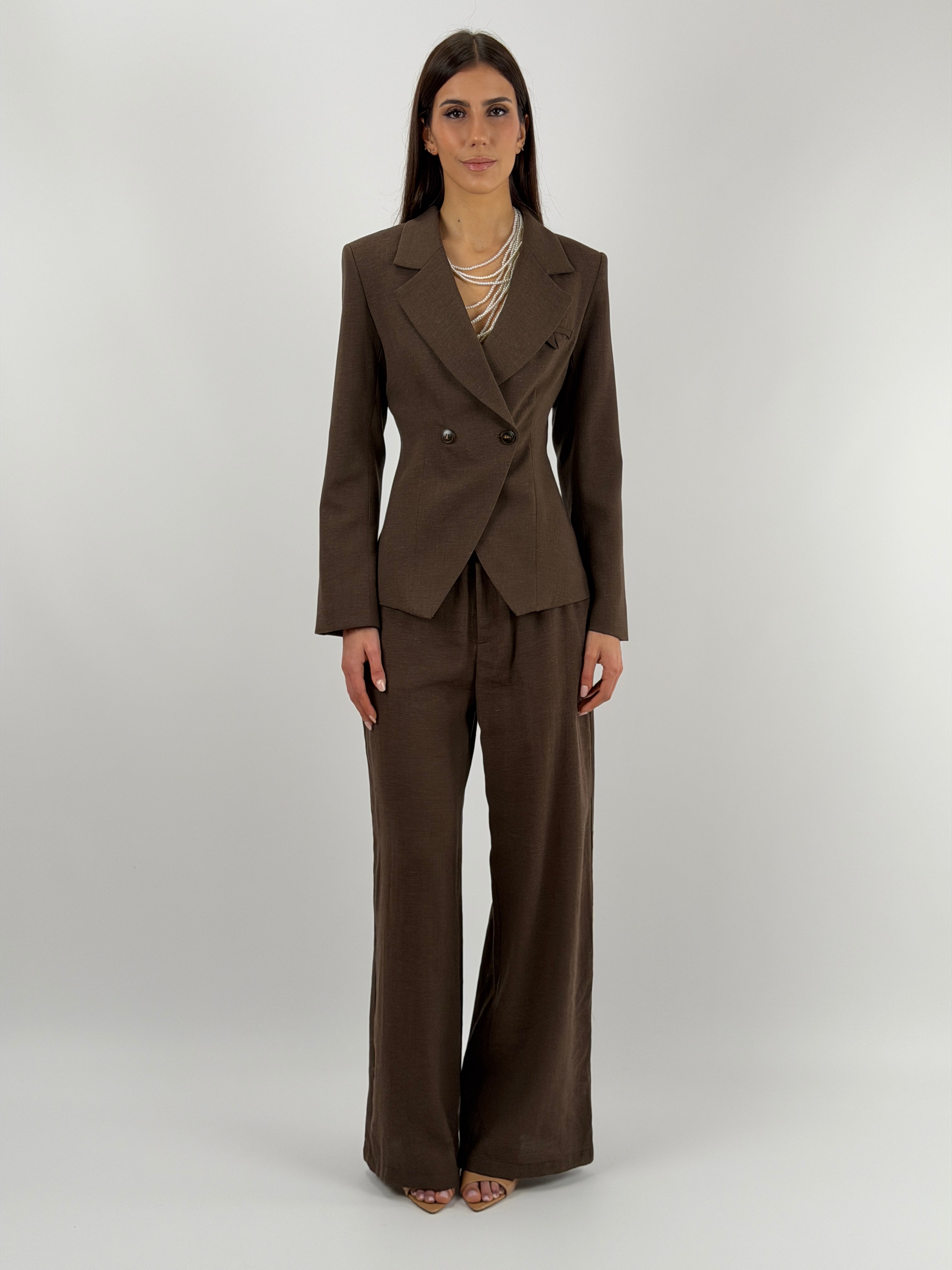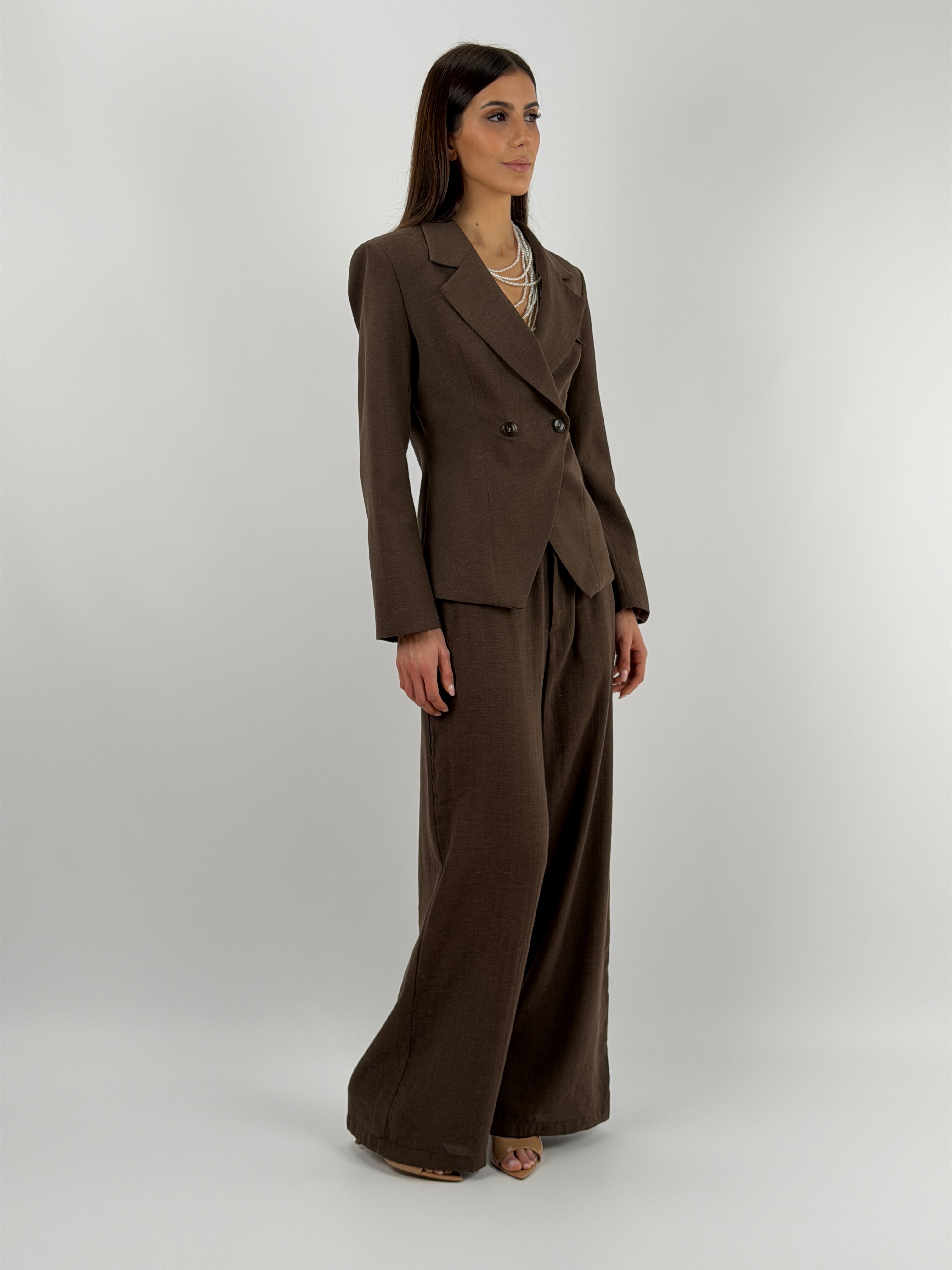 Pantalone Lumina a palazzo wide leg in misto lino marrone con passanti per cintura, chiusura con zip e gancetto, tasche laterali e tasche sul retro a filetto con dettaglio a triangolo