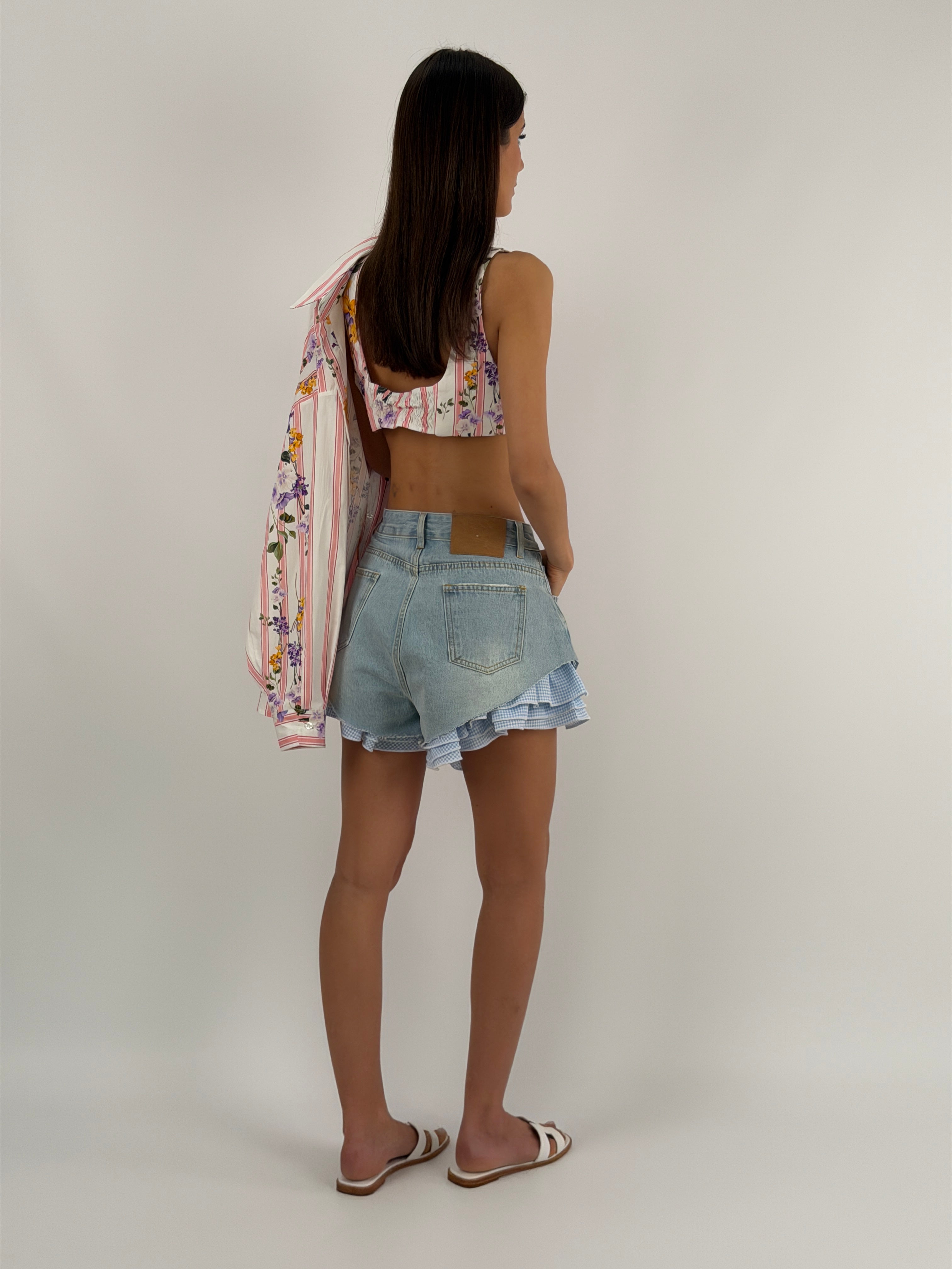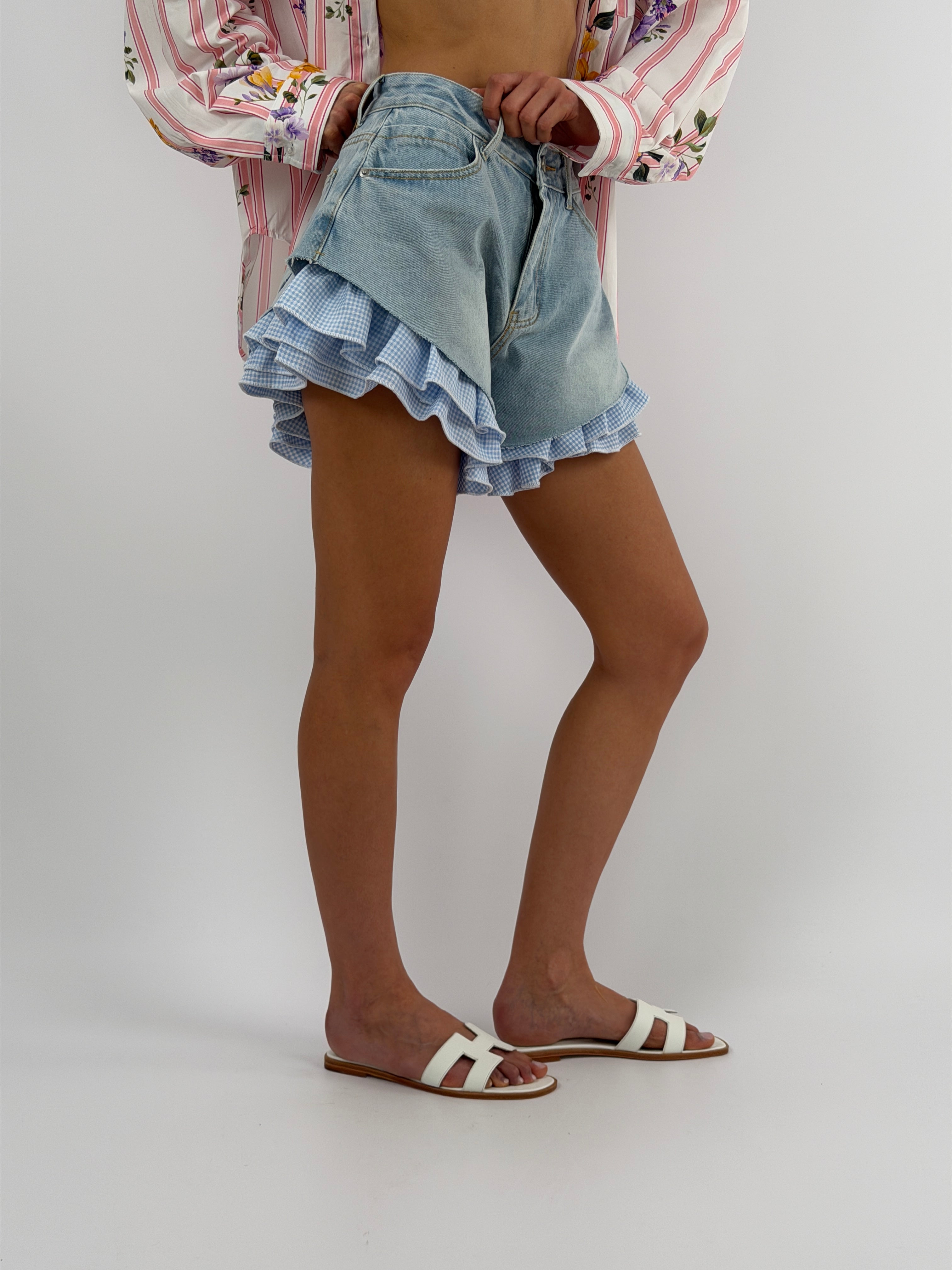 Pantaloncino corto in denim lavaggio chiaro sgambato con volant (removibile) in fantasia vichy, cinque tasche, chiusura con zip e bottone, passanti in vita e cuciture a contrasto
