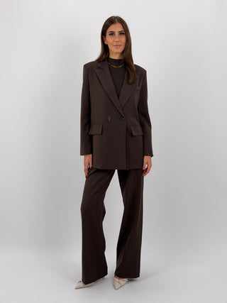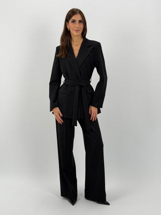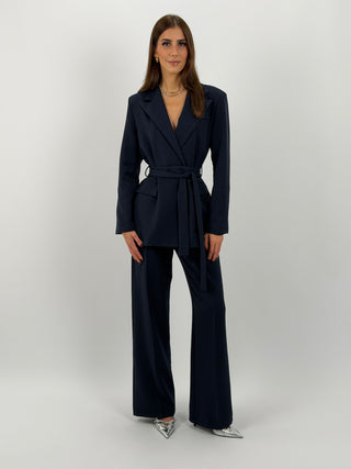 Completo giallo satin con blazer doppiopetto e pantalone palazzo. Giacca con bottoni tono su tono e fodera interna, pantalone con elastico in vita e laccetti finti. Elegante e raffinato.