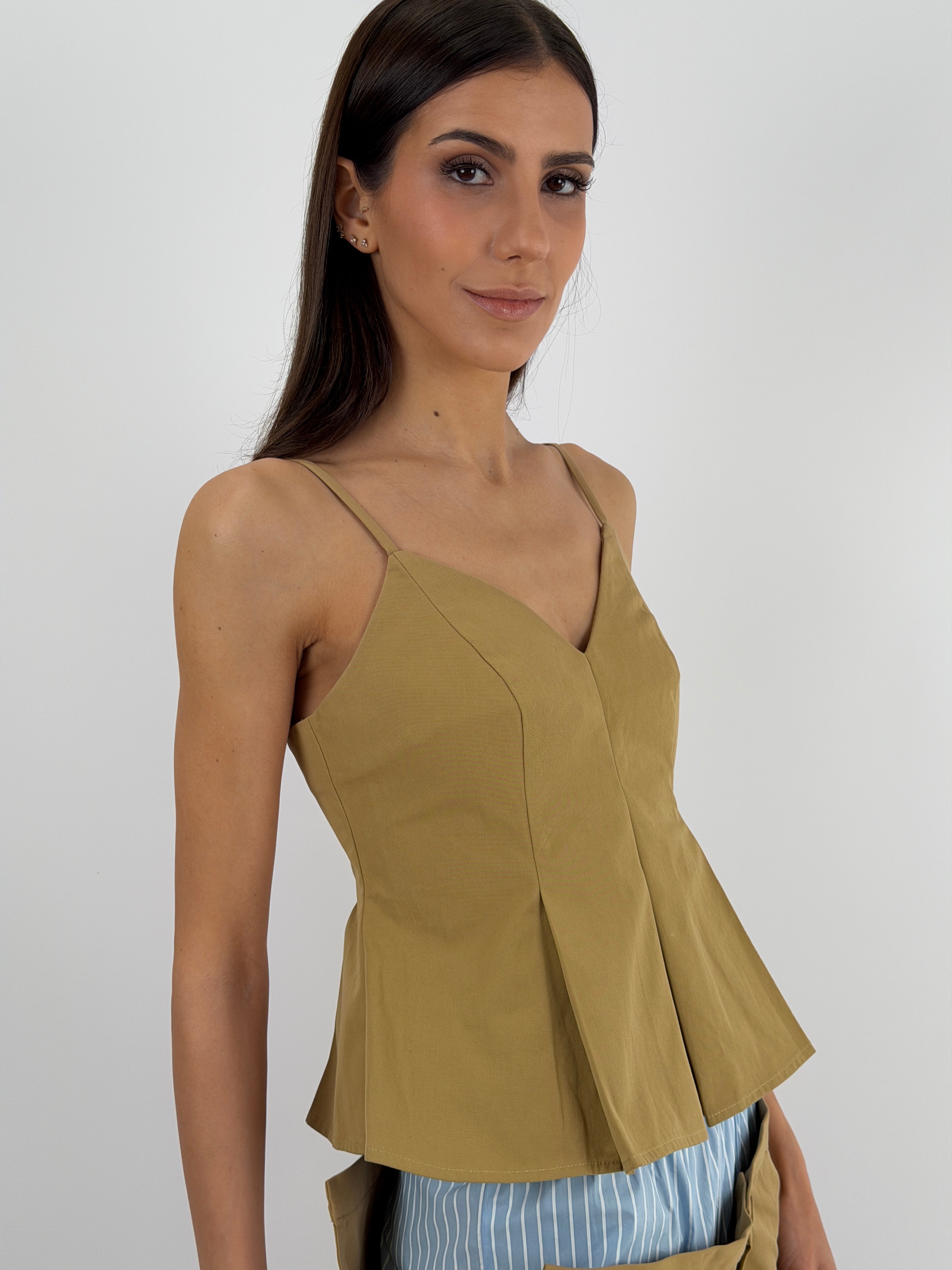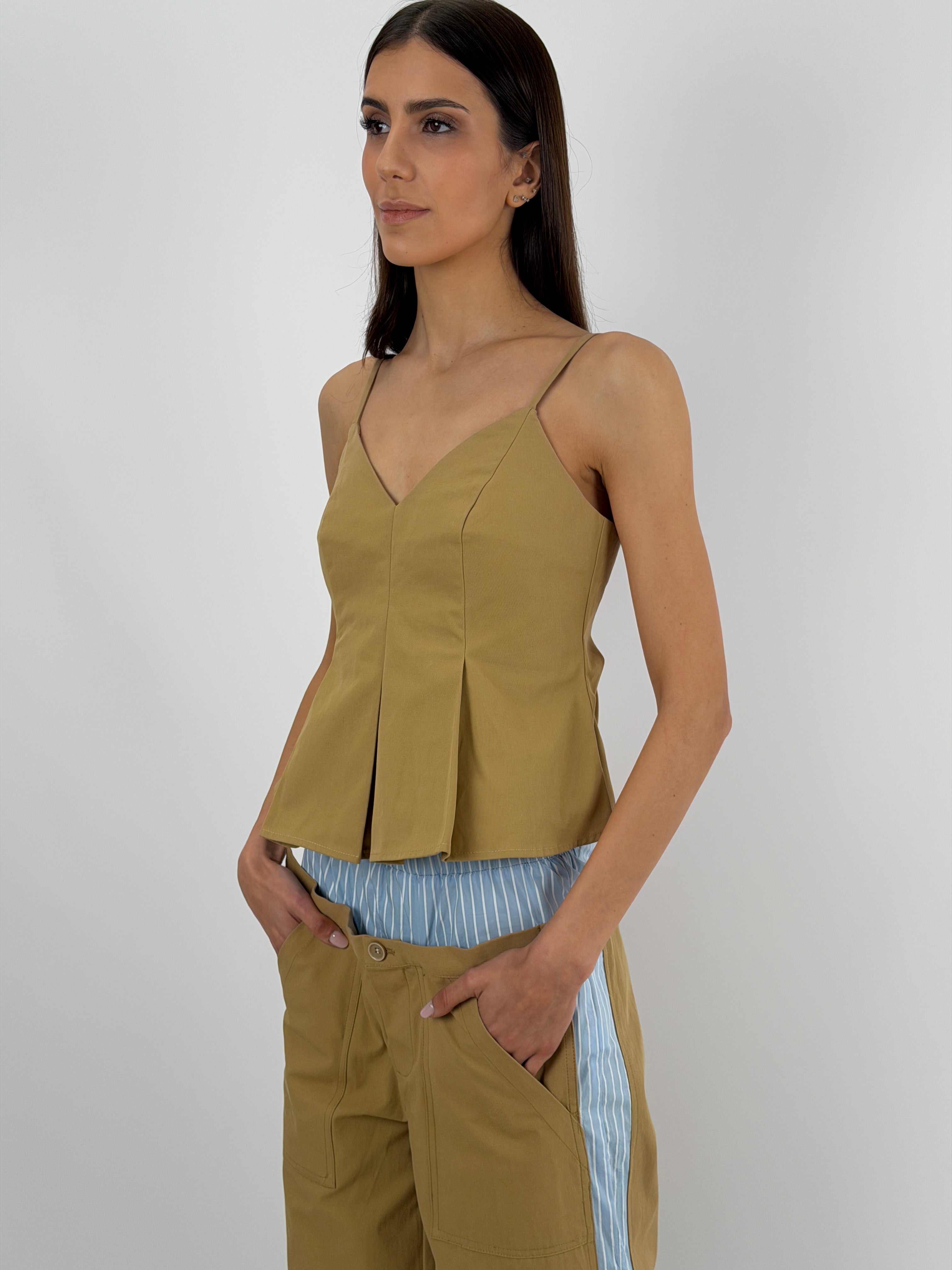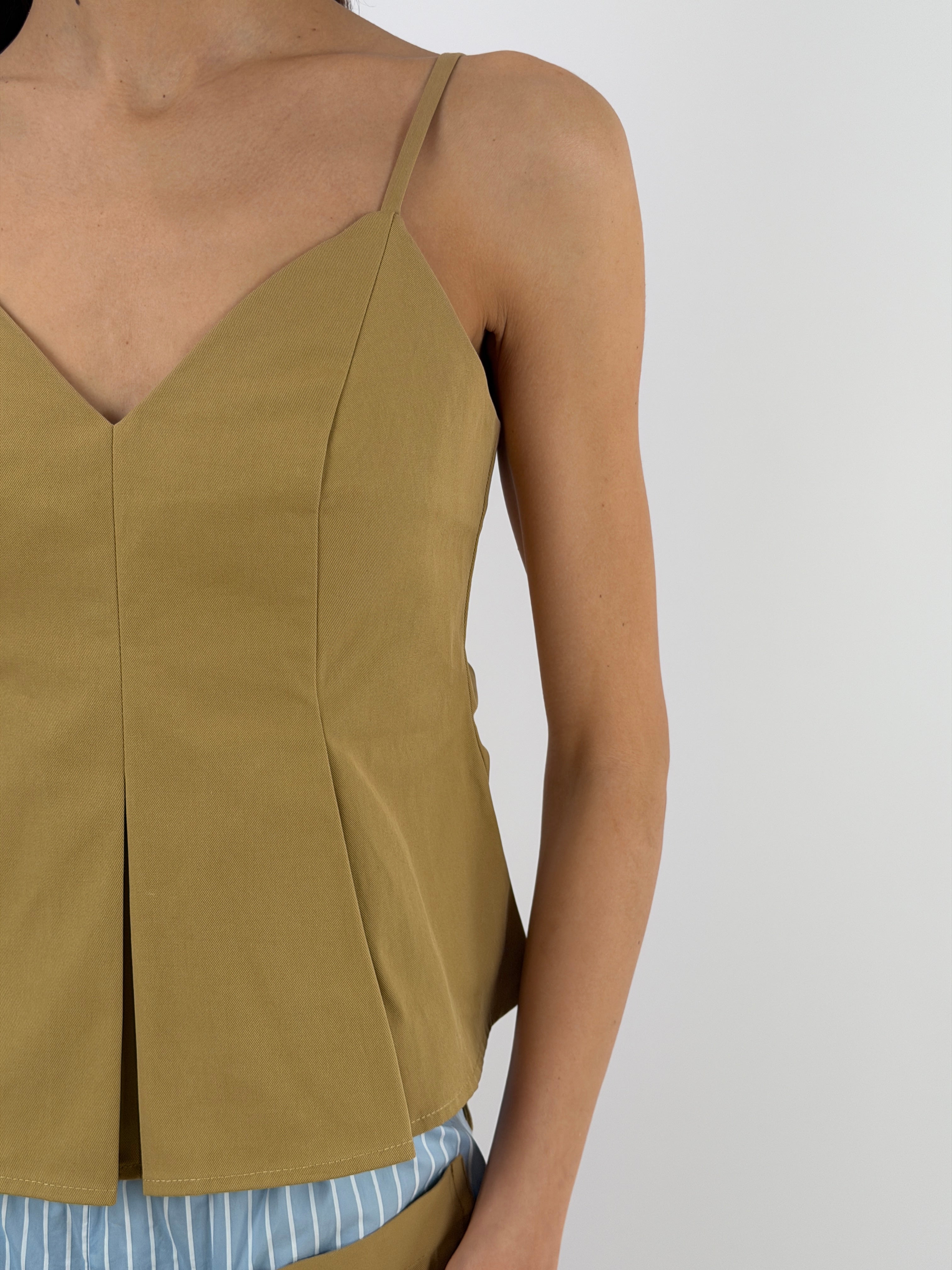 Top Lumina color cammello con coppe a triangolo, spalline sottili e regolabili e chiusura con zip sul retro